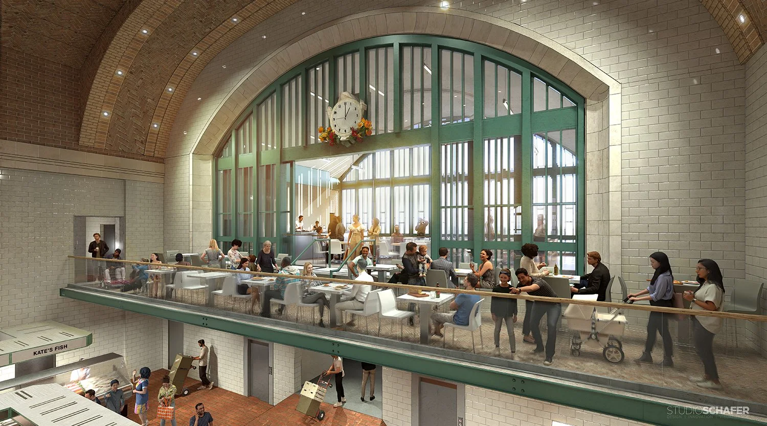 To meet demand for food to eat in the Market while maintaining the historic focus on fresh and specialty foods, MVI proposed converting the detached North Arcade into a food hall while consolidating the produce vendors in an upgraded East Arcade. MVI also proposed new event and education spaces, including a hands-on teaching kitchen in the mezzanine.